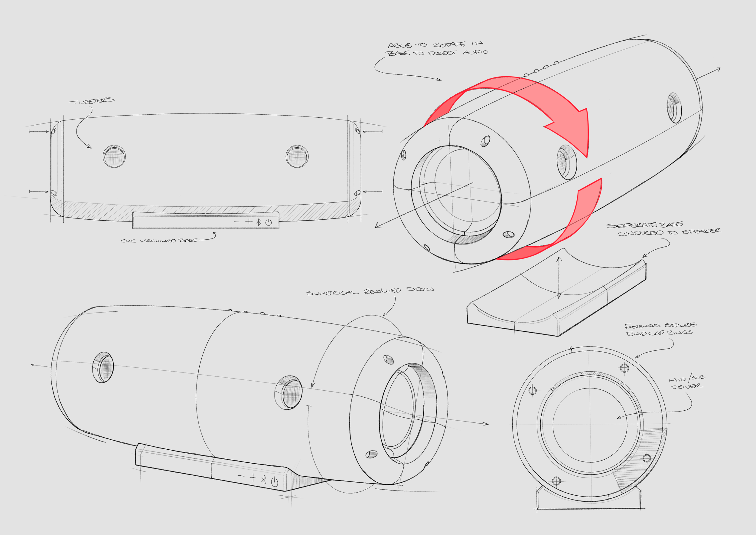 The conception of the Rotate speaker began by identifying the limitations of conventional bookshelf speakers. Realising their restricted nature in how they direct audio, concepts on how this could be achieved were ideated on. While subwoofers and mid-range drivers require less direction, tweeters are the prime suspect on what driver units would benefit from articulation to improve the listening experience.